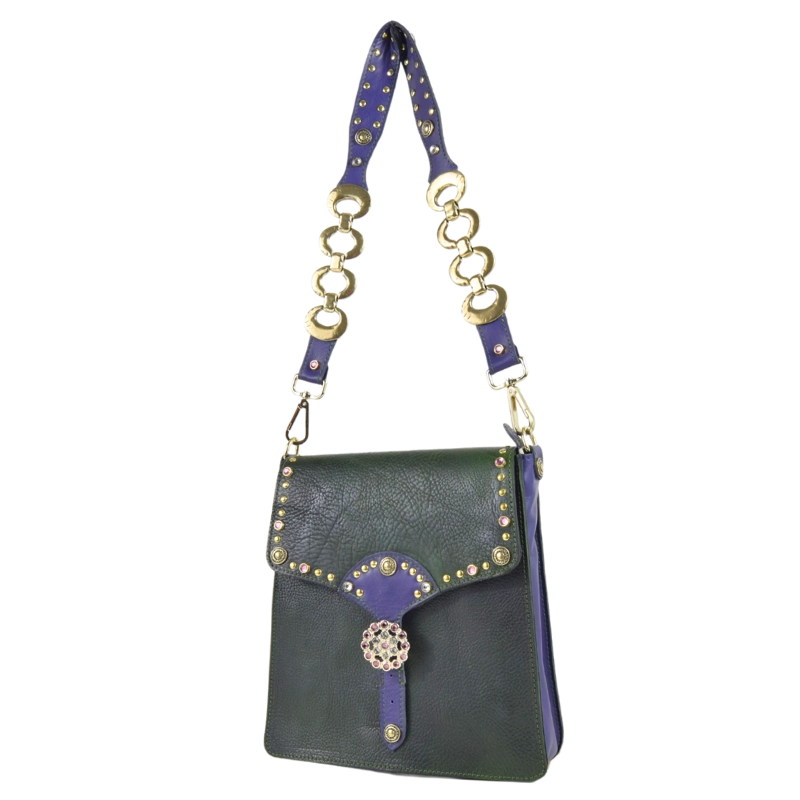 Ogni borsa è creata nel nostro laboratorio con tecniche tradizionali, rendendola irripetibile. Il cuoio naturale tinto a mano si modella nel tempo, acquisendo carattere e raccontando la tua storia, giorno dopo giorno. Gli strass donano luce ed eleganza e la bellissima tracolla, impreziosita da dettagli incatenati, rende questa borsa un piccolo gioiello da sfoggiare nelle tue serate più importanti.