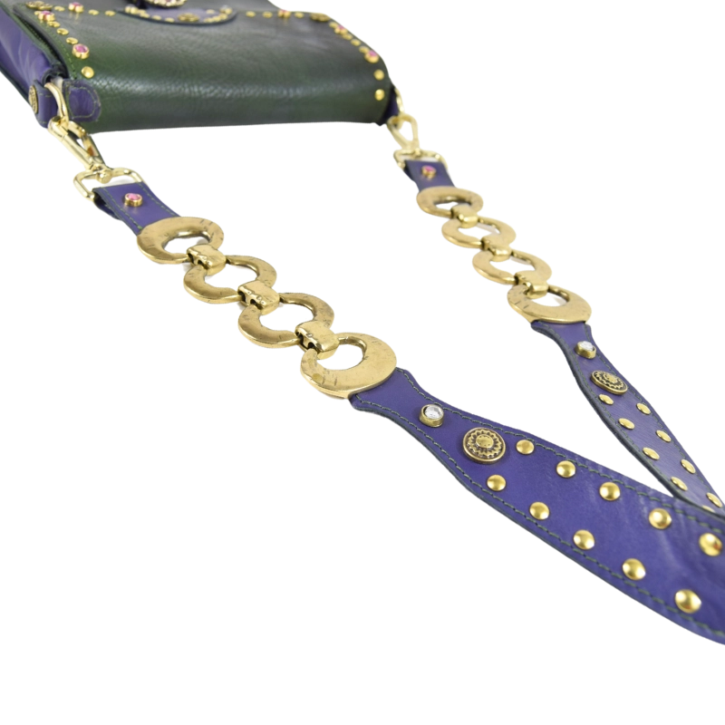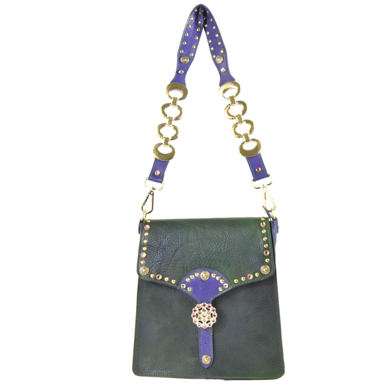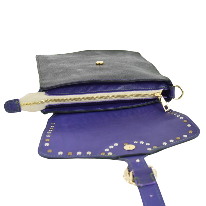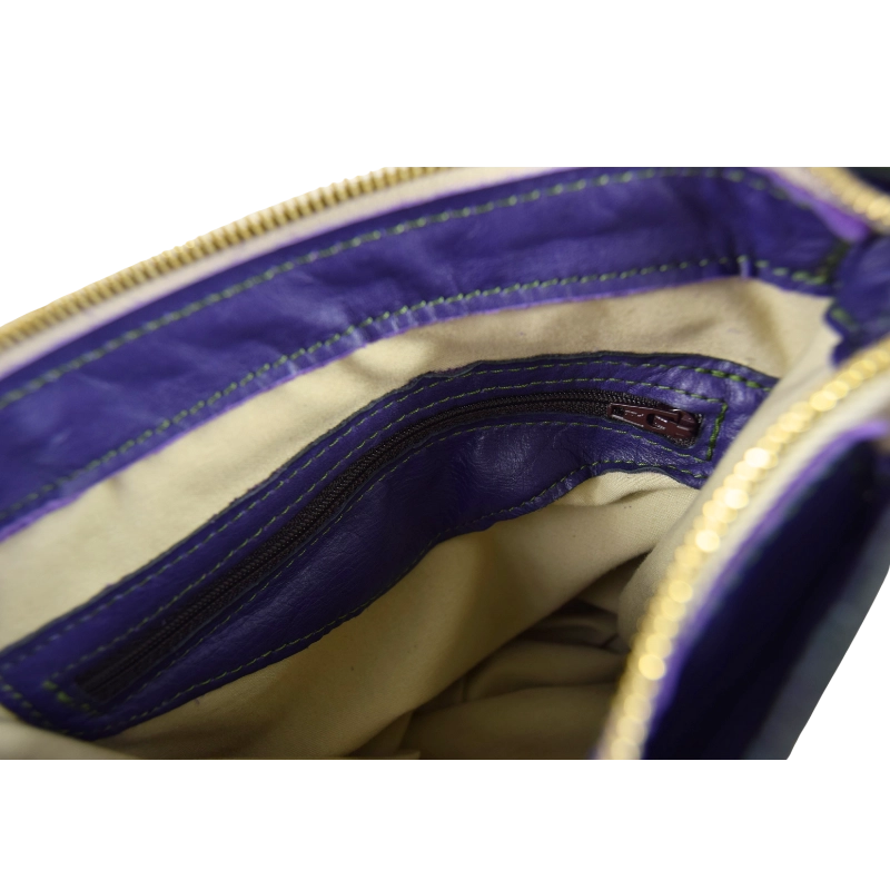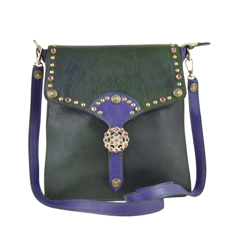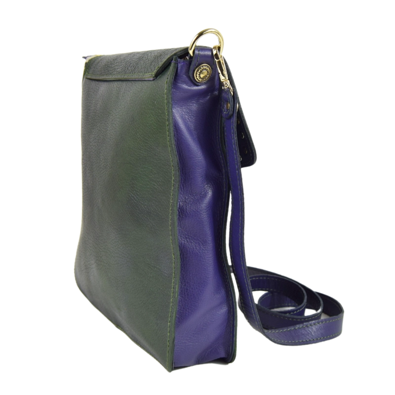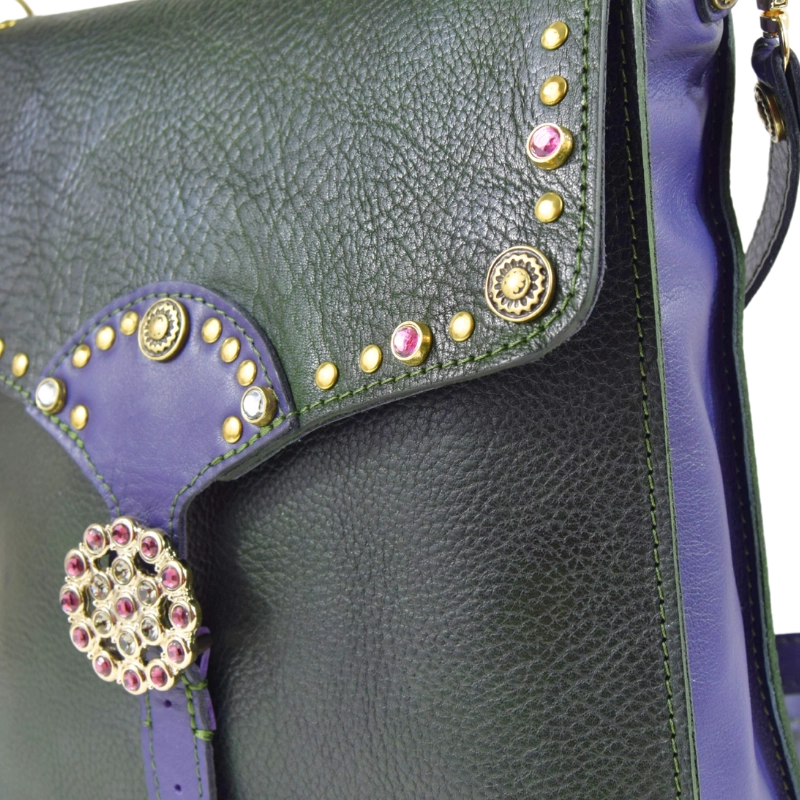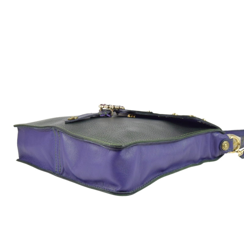 • Realizzata al 100% in vera pelle. Pellame viola: vitello. Pellame verde: cuoio tinto a mano sui toni del verde. Per tanto le sfumature di colore possono variare dalla foto originaria e ciò non è da considerarsi un difetto, ma una peculiarità del lavoro artigianale