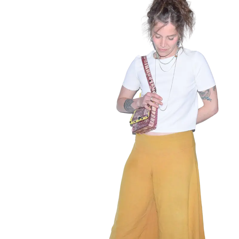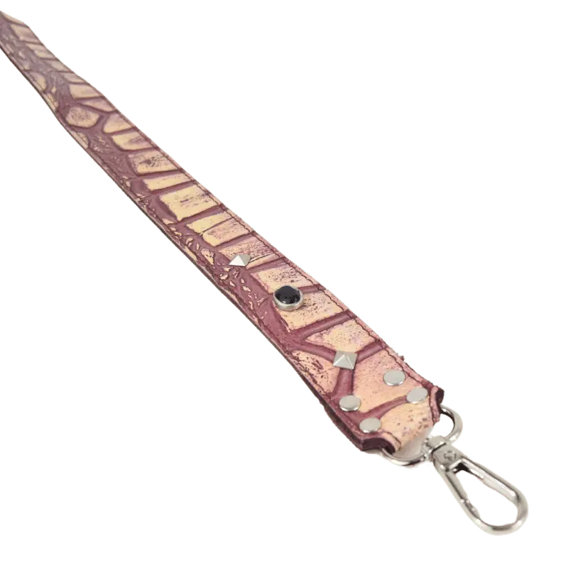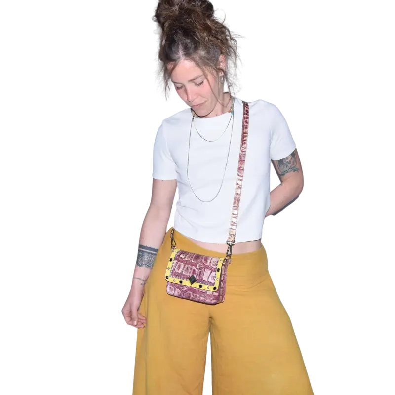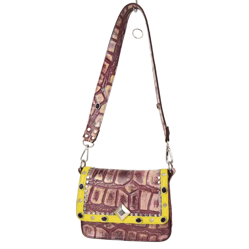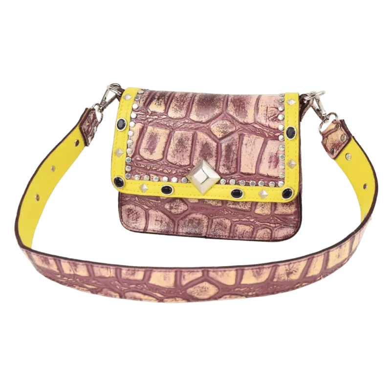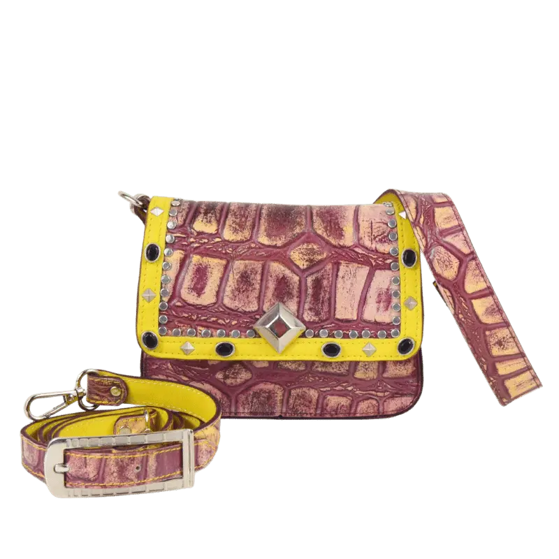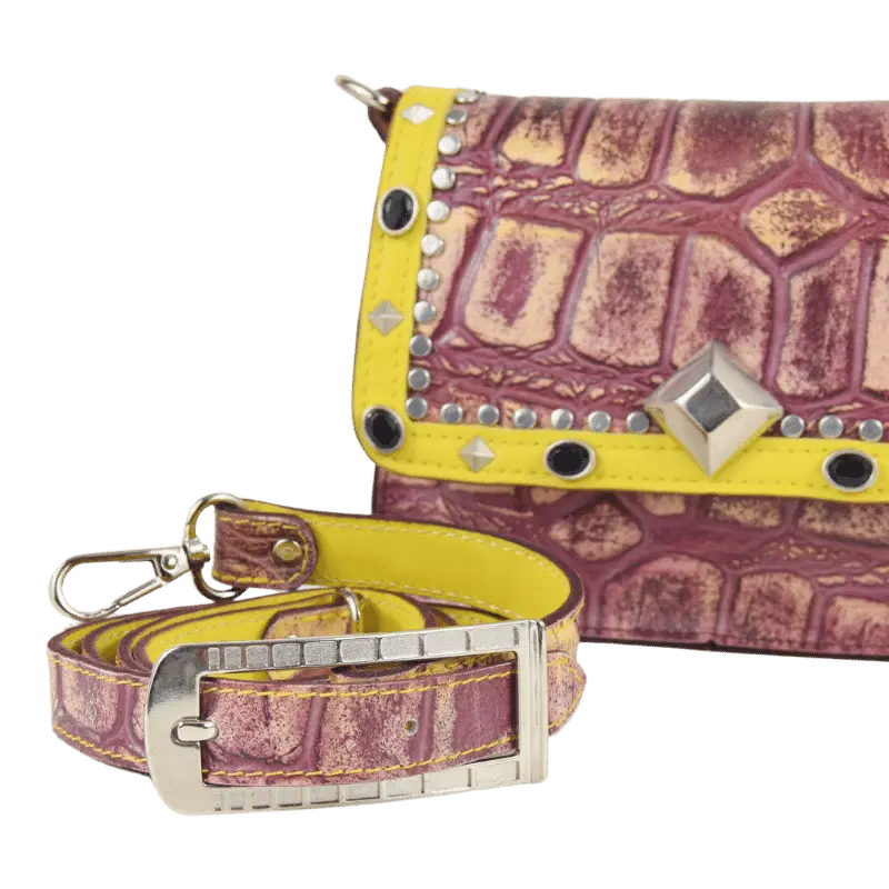 La borsetta Pepi è realizzata da due diversi tipi di pellami. Il pellame color vinaccia è un pellame stampato effetto coccodrillo. Il pellame giallo è vitello morbido.