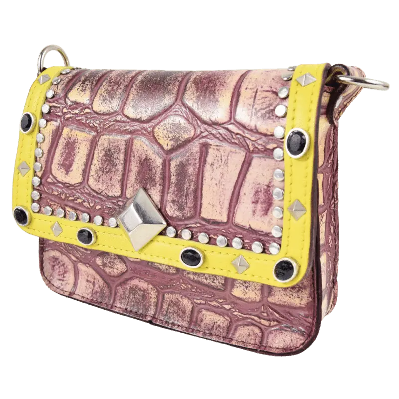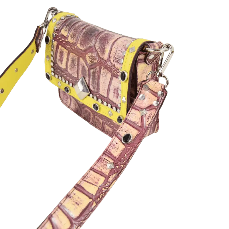 Il pellame stampato cocco, abbinato a dettagli gialli e in contrasto con le borchie nere, fanno si che la borsa Pepi sia perfetta per rendere unico e particolare il tuo look.