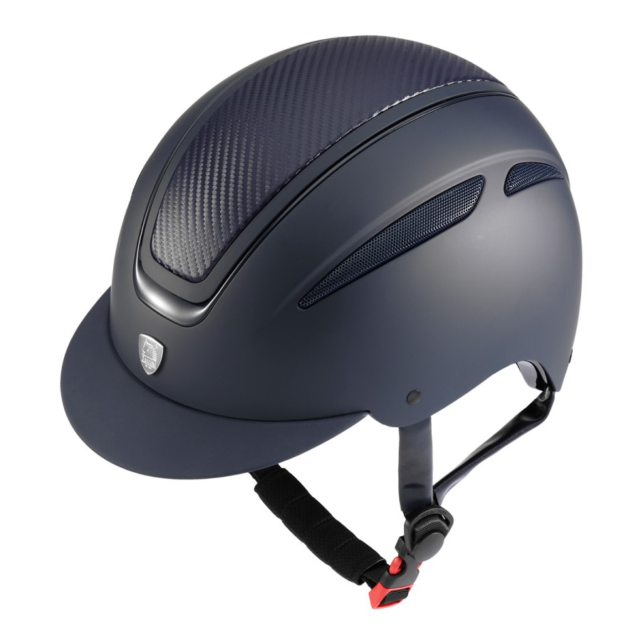 Casco da equitazione facile da regolare con il cinturino a strappo posizionato sotto la gola e la rotellina posteriore.