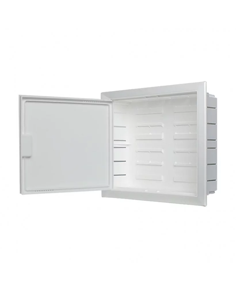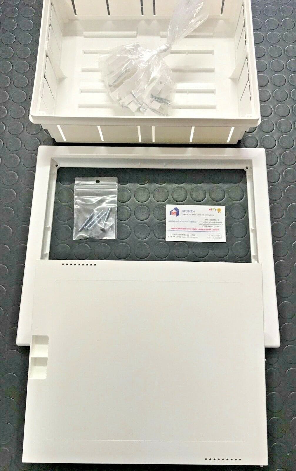 Cassetta di ispezione in plastica, adatta per l’installazione di collettori termoelettrici, semplici, con chiavetta o complanari per impianti di riscaldamento e raffrescamento.