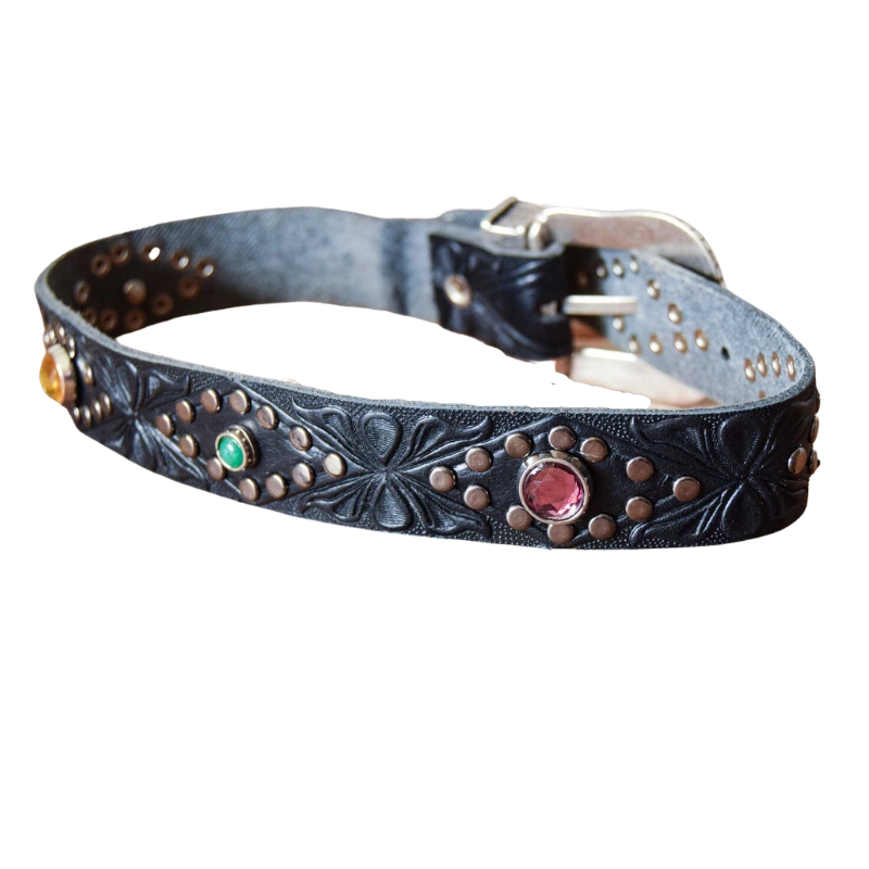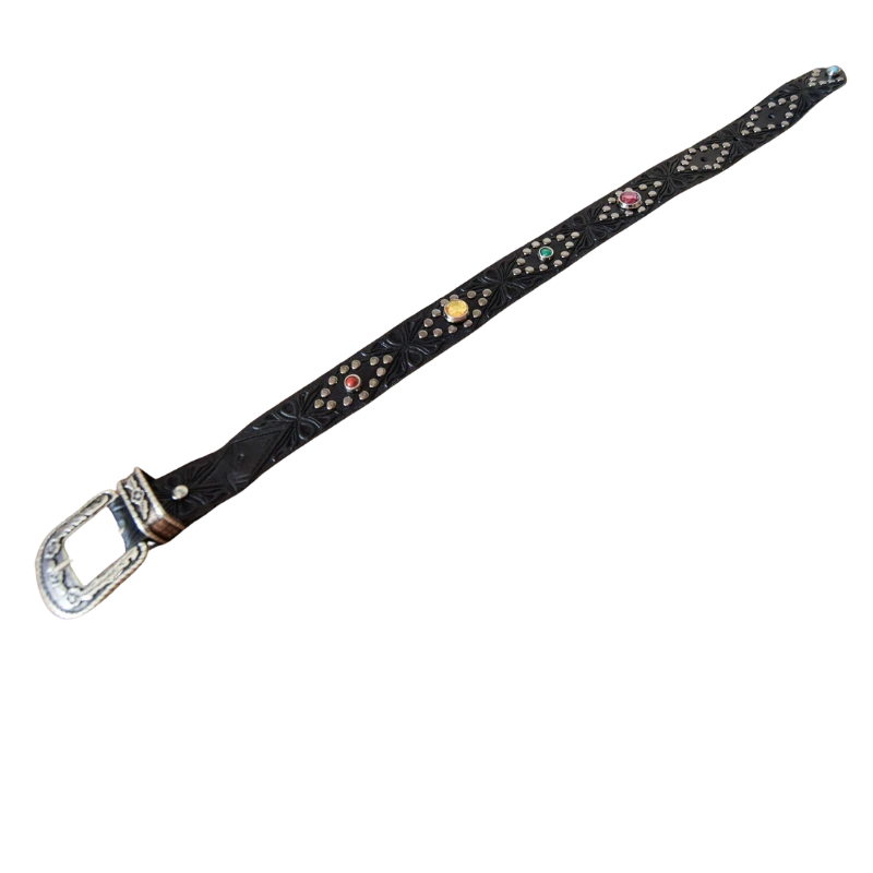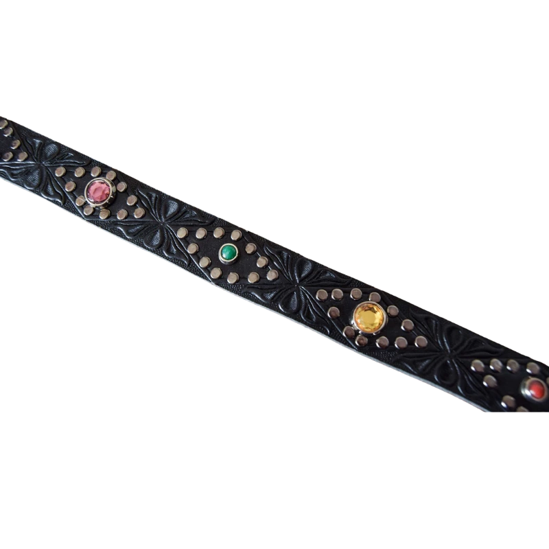 Cinturini per stivale realizzati con un pellame nero, stampato a fuoco con dettagli geometrici e borchiati interamente a mano con cristalli colorati.