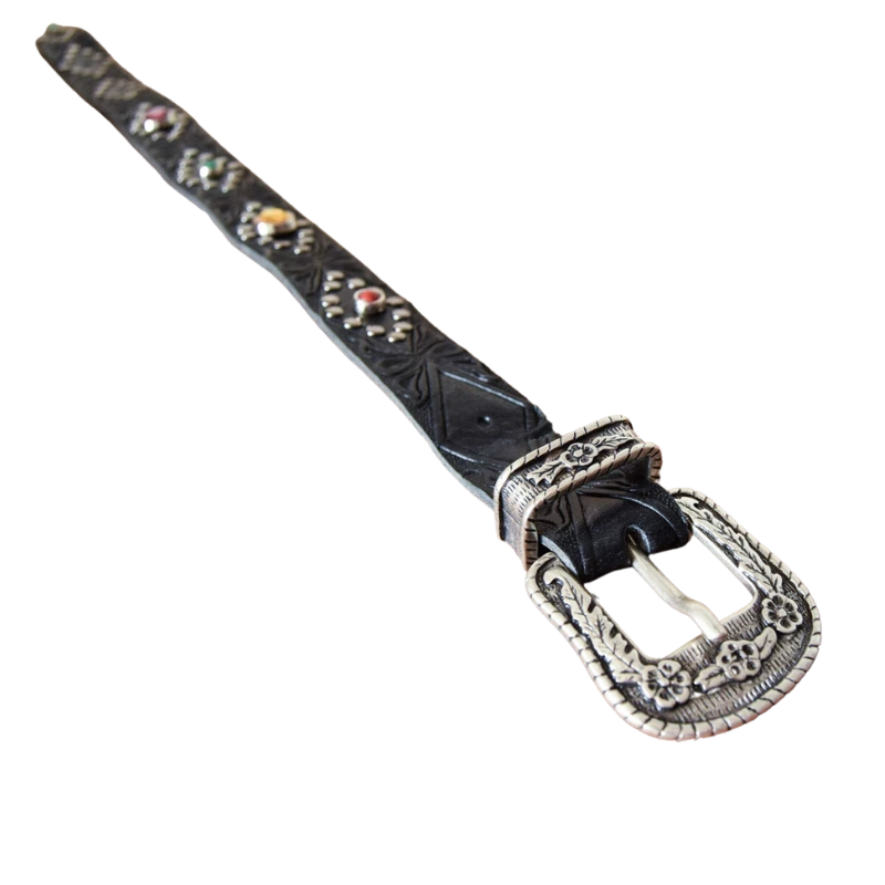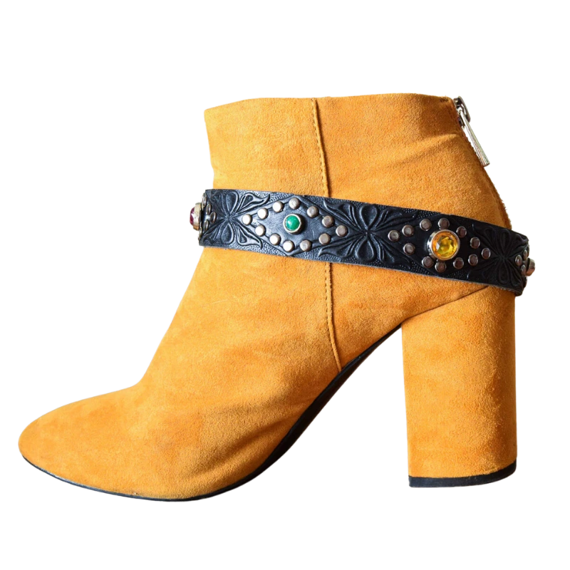 Sono borchiati a mano con rivetti color argento e impreziositi con cristalli color giallo, verde e viola. La lunghezza è regolabile grazie alla fibbia abbinata in stile country e possono essere indossati su qualsiasi tipo di stivale con lunghezza circonferenza compresa tra i 30 e 35cm.