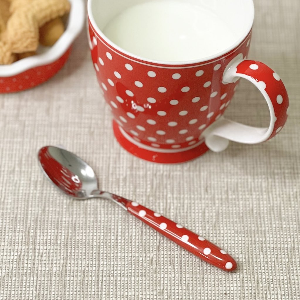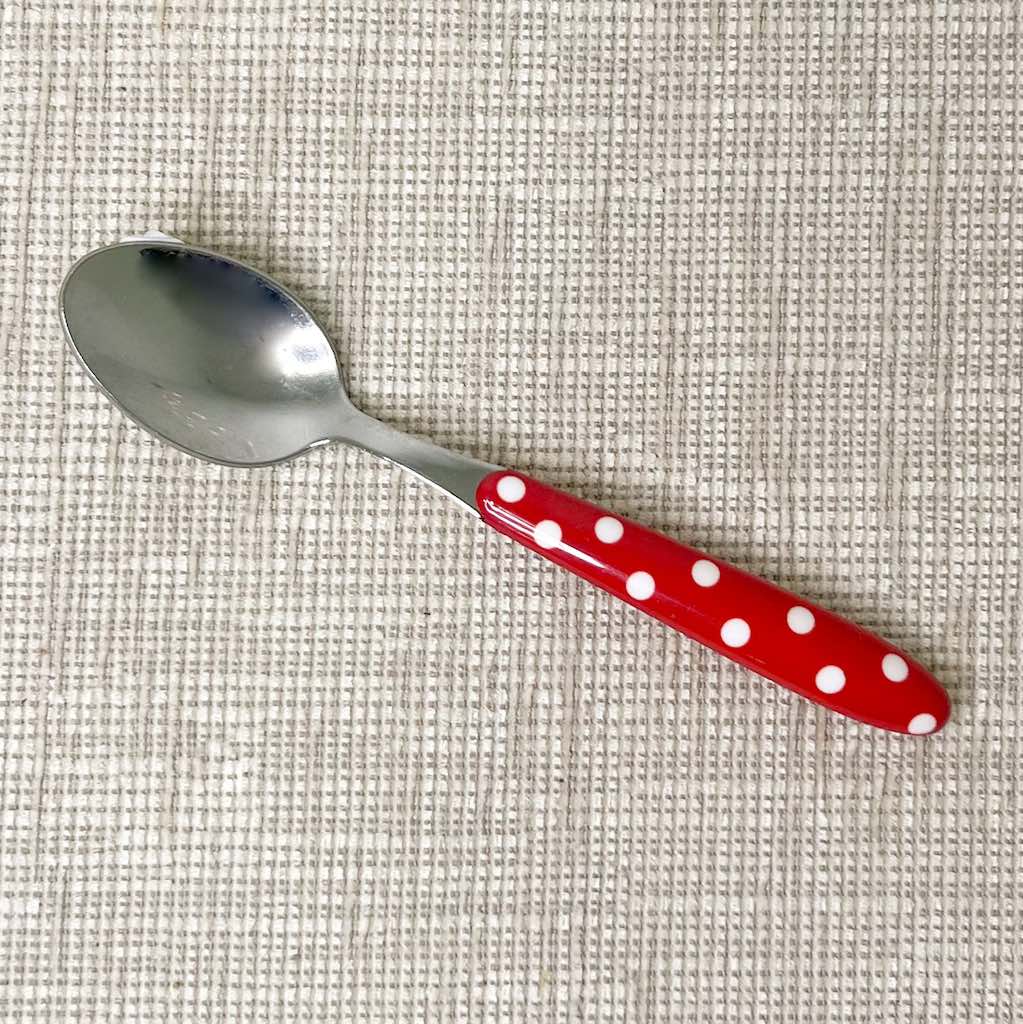 Completa il tuo set da colazione o da tè con questo cucchiaino rosso a pois bianchi, perfetto per aggiungere un tocco di stile alla tua tavola.