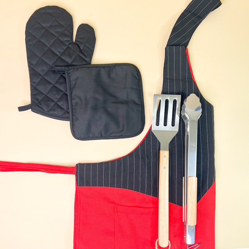 Questo set barbecue è perfetto per gli amanti della griglia! Include grembiule, spatola, pinza, apribottiglie, presina e manopola, fornendo tutto il necessario per cucinare con stile e praticità. Disponibile in due versioni: grembiule nero per un look elegante e classico, oppure grembiule gessato e rosso per un tocco più vivace.